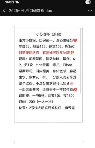 小苏是我8月初约思涵,思涵没在,推荐过来的闺蜜,当时体验就不错,看了狼友对思涵的评价庆幸自己没约思涵哈哈哈,论坛里好像没有友友发过小苏的帖子,我这边强烈推荐一手 国庆假期,连着两日宿醉,下午两点才返回西安,恰好看到小苏更新了朋友圈,遂询问是否在西安(妹子老家在甘肃,第一次约过后就回了老家,今日得知妹子在甘肃上班,放假了才有时间来西安,狼友们抓紧),立马预约了3点的课,课室我清楚,到了发消息给我开门,见面就是黑丝+情趣内衣,由于两日宿醉没洗澡,兄弟先仔细的冲了个澡,然后轻车熟路直接进卧室。身材能看得出来年纪,但是肚子没赘肉,后背也能看到蝴蝶骨,胳膊稍微壮一点,腿和脚穿的丝袜,看着不胖,兄弟对脚没什么兴趣。寒暄两句得知最近生意一般,我还是今天第一位,妹子脱了情趣内衣直接开始胸推,舔三角区,服务一会儿我一把拉进怀里,上下其手,妹子乳头很敏感(胸不大,稍微下垂,躺着观感不错,乳头偏大,一眼奶过娃),下边毛不多,重点B确实漂亮,兄弟不懂这是什么户型,直接开扣,前戏她玩了我3分钟,我玩了她起码15分钟,扣的眼睛紧闭抓我胳膊,我让她摸豆我三指进入。姿势比较累人,直接两腿抗肩开始磨,磨了一分钟下边已经湿的不行了,妹子求我带套进来,不啰嗦,直接戴上套挑逗,妹子抱着我的屁股往里边蹭,我直接趴她身上,妹子秒懂腿从内侧勾住我的腿,我胳膊圈住脖子面对面式开始耸动,什么九浅一深,主打的就是一个力大砖飞,七八分钟后妹子不对劲了,叫声从夹子变成牛叫了,说自己要到了,我一下跪起双腿抗肩,一顿猛插,妹子双腿紧夹抽了几下来了高潮,妈的还吸了我脖子,别给我吸出草莓了(兄弟还是第一次给鸡干高潮,应该是前戏给的足),我自己也差一点发射,立马停住稍微缓一下,不容妹子休息立马翻过去开始后入,但是妹子没劲,屁股翘不起来,兄弟个子比较高,体态不太舒服,这时候妹子手机响了,我说来客户了?妹子说没,是时间应该到了,好,咱也不磨蹭,我平躺妹子跪趴在我身上,抱住上半身一顿猛插,左手想扣扣菊花的,结果没想到水流到了屁股,直接扣进去了,然后一套不解释连招,在妹子的牛叫下完成了发射。 完事拔出来后妹子第一句话是我拿湿巾帮你擦一下手指,卧槽还挺贴心,然后洗澡聊了两句,现金支付,出门回家。 论坛里除了我真没见到退小苏的,也叫苏苏,不说多好看,165的个子体重目测110,再加上这个服务,真心觉得性价比不错,本狼问过几次都是没在西安,这次真心推荐给各位狼友,希望狼友国庆能上到性价比不错的课,广告死全家终身不举,我没给妹子说帮她在论坛打广告,你们加了微信直接问有没有课就行,别把兄弟暴露了。